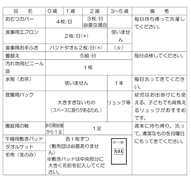 - ふとんは、敷きパッドと掛けぶとんとしてタオルケットと毛布(冬のみ)を、見えるところに大きく名前を書いてご用意ください 。