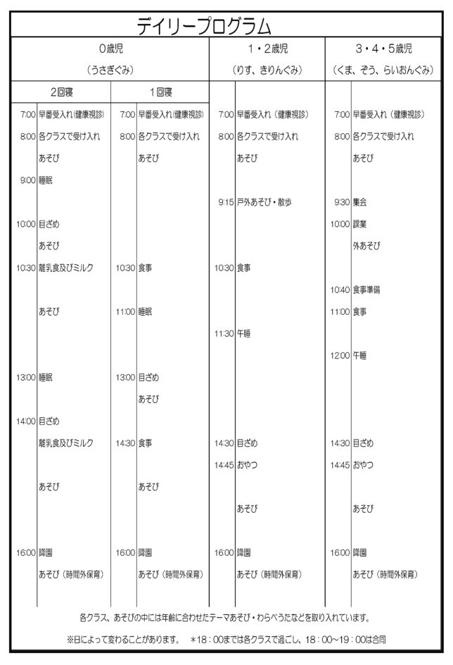 - 年間行事予定、年間保育目標は「おたより」でお知らせします。各クラスのデイリープログラム(保育園での一日)は、下記にあるような流れになっています。