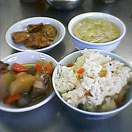 きのこおこわ。揚げ餃子。大根の煮もの。白菜の味噌汁。りんご。