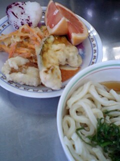 天ぷらうどん。ゆかりおにぎり。果物。今日は先週できなかったうどんに変更しました。暑い日だったのでよく食べました。
