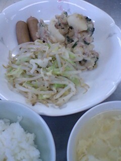 ご飯。麻婆じゃがいも。ウインナー。ナムル。卵と野菜のスープ。