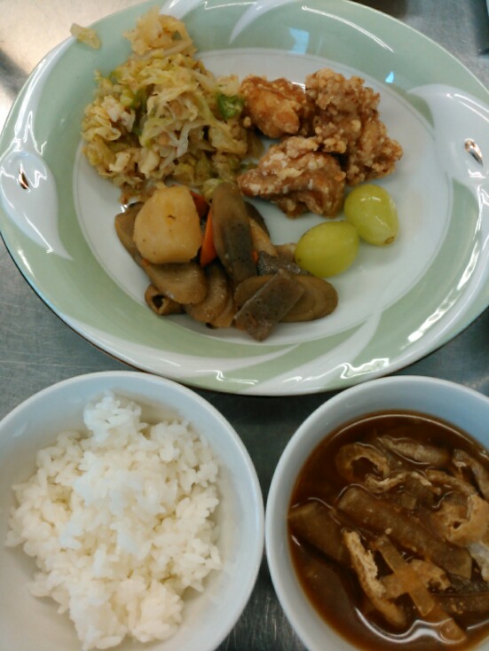 ご飯。唐揚げ。根菜とちくわの煮物。キャベツのおかかあえ。大根の味噌汁。