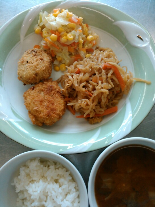 ご飯。手作りコロッケ。コーンサラダ。切り干し大根の煮物。味噌汁。