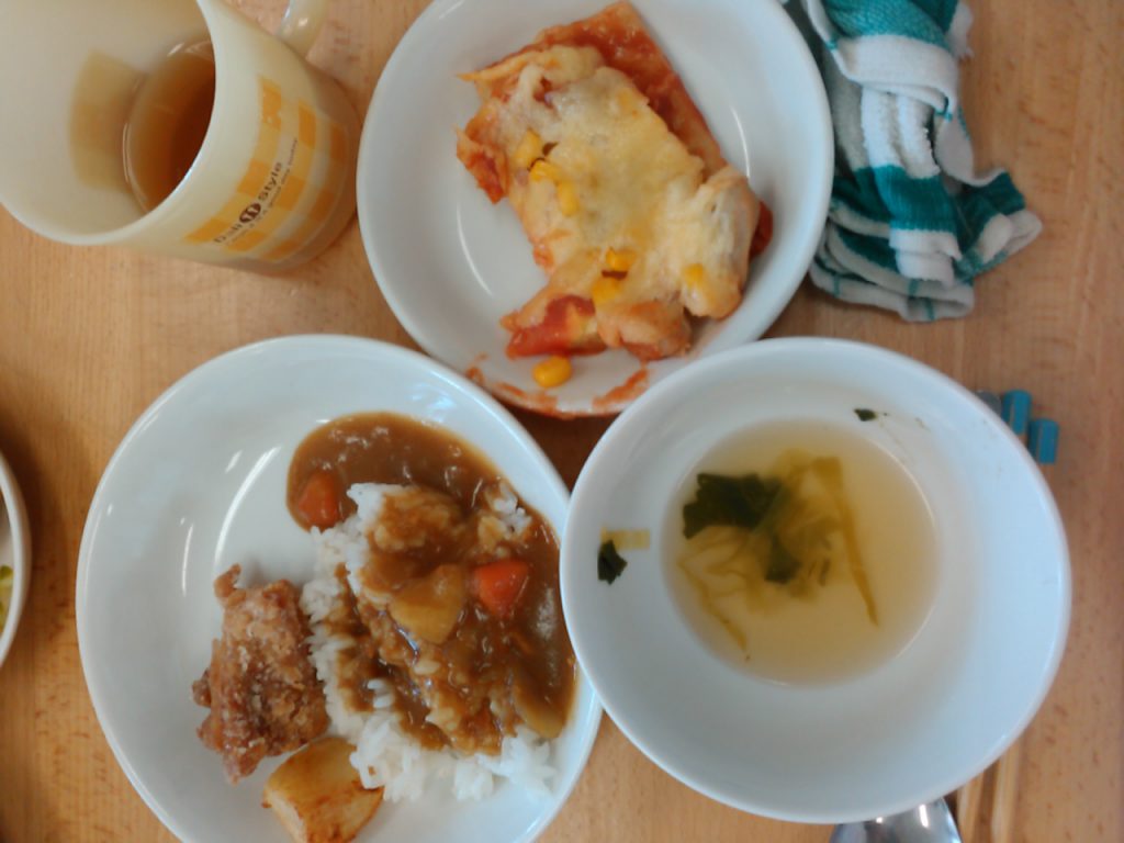 お別れバイキング献立は、カレー、手作りピザ、からあげ、ポテト、サラダ、スープ、デザートでした。