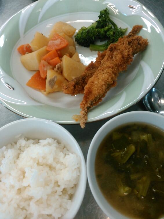 ご飯。ししゃもフライ。肉じゃが。ブロッコリーのおかかあえ。のらぼうの味噌汁。りすは鮭のたつたあげでした。