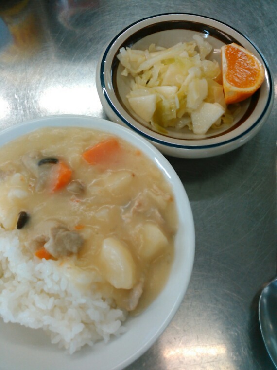 ご飯。クリームシチュー。りんごのサラダ。果物。今日はぞう、らいおんくみはお花見さんぽに行きました。お花見弁当を作って届けました。