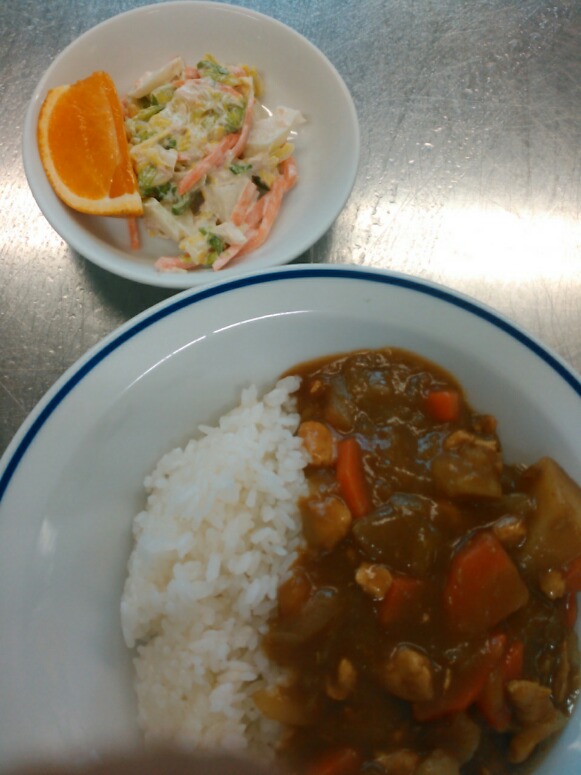 カレーライス。ツナサラダ。果物。りす、きりんはシチューでした。今日はおやつをマカロニのきな粉あえに変更しました。