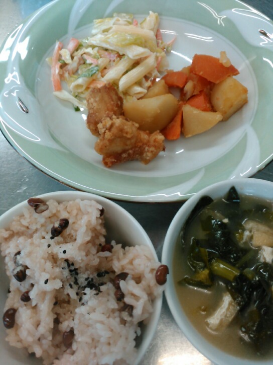 お赤飯。からあげ。じゃがいもの煮物。マカロニサラダ。味噌汁。ゼリー。今日は入園、進級お祝いの会がありました。お赤飯を炊いてお祝いしました。