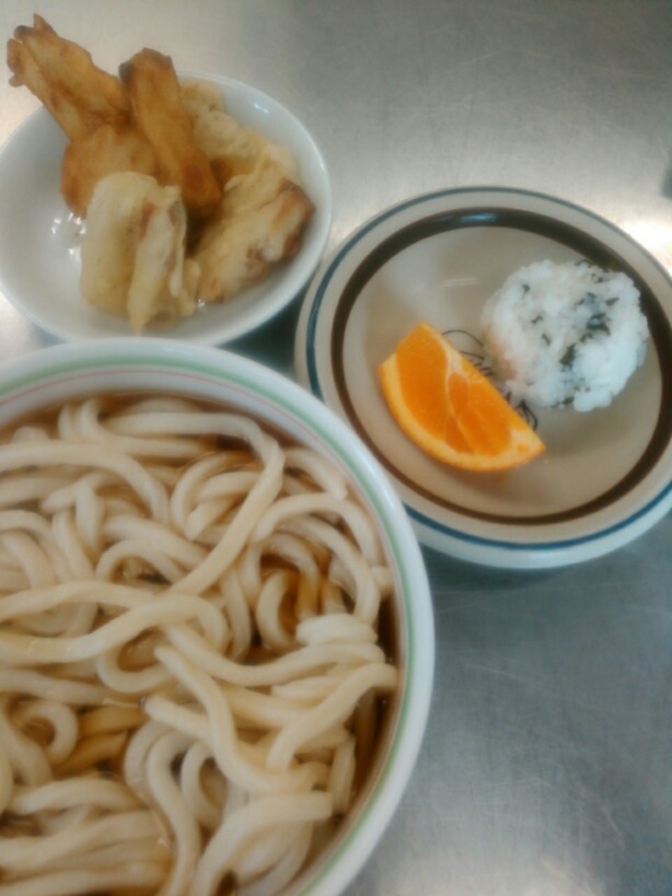 天ぷらうどん。おにぎり。果物。
