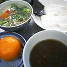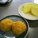 きな粉おはぎ。牛乳。りんご。牛乳は暖めました。