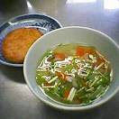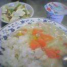 七草風おじや。おせんべい。明日は七草です。保育園はすずしろ入りおじやです。野菜が高いので大根、人参、きょうなで作りました。