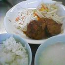 ご飯。ハンバーグ。大根サラダ。マカロニソテー。ミルクスープ。