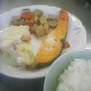 ご飯。焼魚。高野豆腐の煮物。ポテトサラダ。白菜の味噌汁。