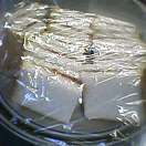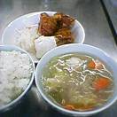 唐揚げ丼。豆腐。大根の塩もみ。白菜と肉団子のスープ。