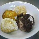 今日の献立。今日はおもちつきです。おもち。豚汁。みかん。
