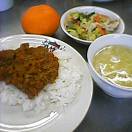 12月12日の献立。ドライカレー。卵スープ。きのこサラダ。みかん。今日の献立はみんな大好きです。