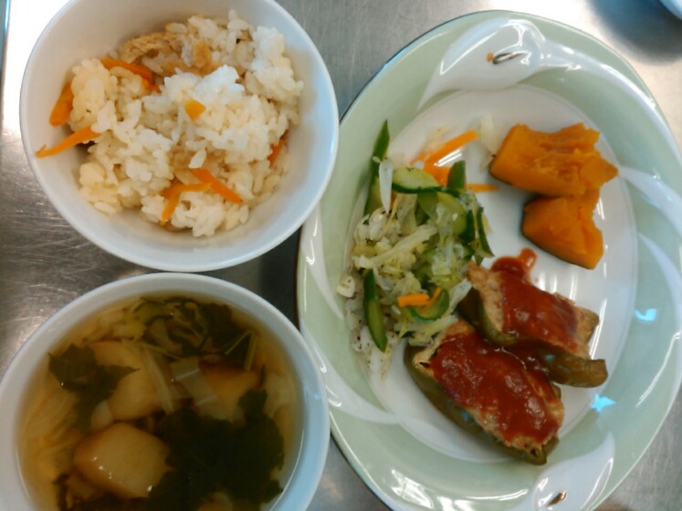 混ぜご飯。ピーマンの肉詰め焼き。ゆかりあえ。カボチャの煮物。スープ。