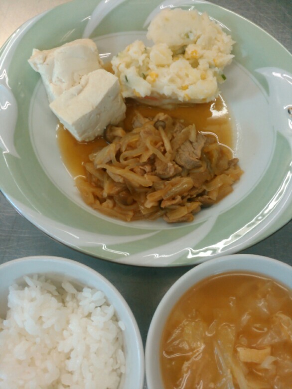 豚丼。豆腐。ポテトサラダ。味噌汁。今日は献立を変更しました。