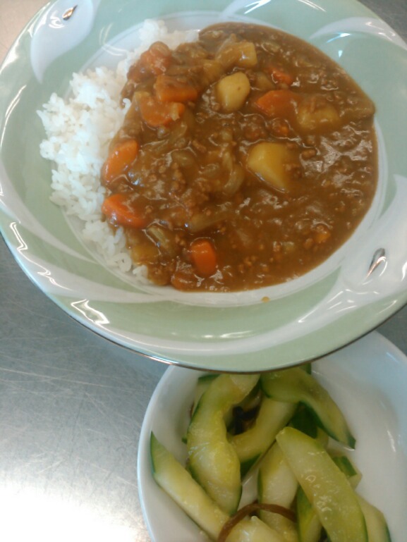 カレーライス。きゅうりの昆布あえ。手作りゼリー。今日はカレーライスでした。りす、きりんくみはハヤシライスでした。りすくみはゼリーではなくオレンジでした。
