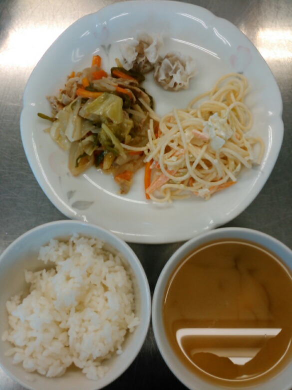 ご飯。焼売。スタミナ炒め。スパサラダ。味噌汁。