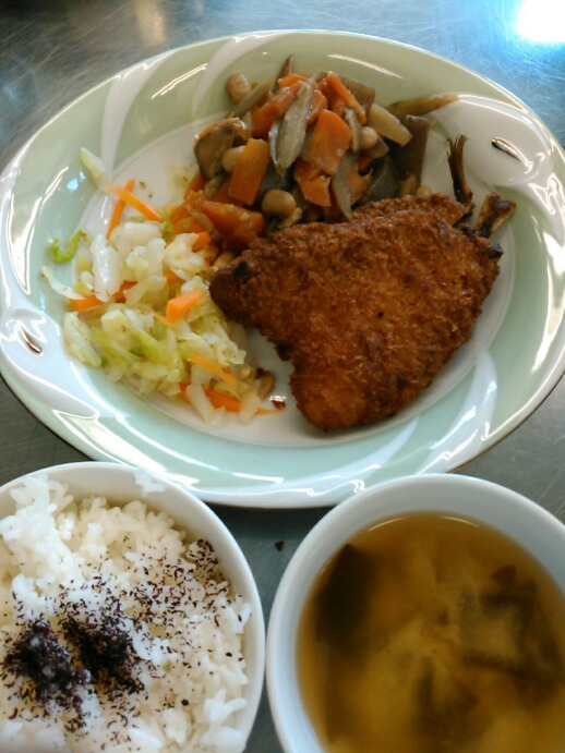 ご飯。アジフライ。大豆の煮物。しおもみ。とうがんの味噌汁。