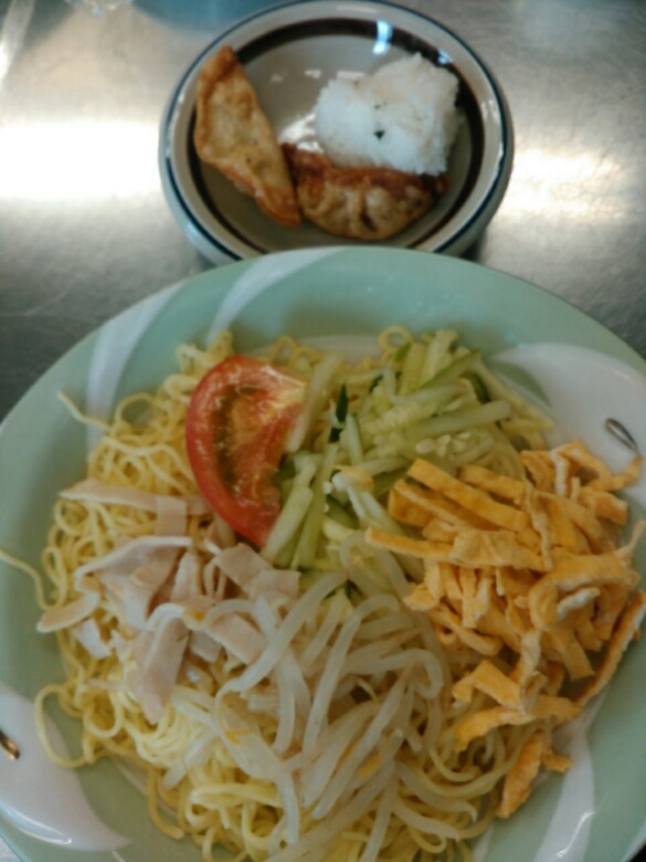 冷やし中華。餃子。おにぎり。今日は冷やし中華でした。りすは冷しうどんにしました。
