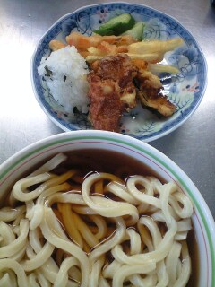 てんぷらうどん。おにぎり。きゅうり。今日のてんぷらはちくわ、かぼちゃ、人参とじゃがいものかき揚げでした。人参とじゃがいもの組み合わせは意外とおいしかったです。