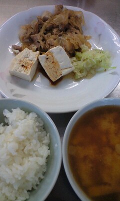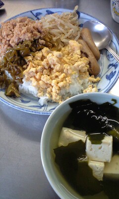 豚肉丼。豆腐。塩もみ。じゃがいもとあげの味噌汁。