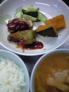 ご飯。ピーマンの肉詰め焼き。かぼちゃの煮物。きゅうり。味噌汁。今日は苦手の子の多いピーマンの肉詰め焼きをつくりました。小さく切ったピーマンにお肉をたくさんのせてやきます。今日も少し食べられた〜という報告をしてくれた子もいてすごいな〜と思いました。みんなで楽しく食べることで嫌いなものもだんだんと食べられるようになりますね。
