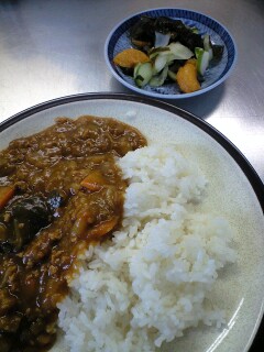夏野菜カレー。きゅうりとみかんのすのもの。