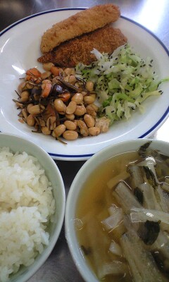 ご飯。魚のフライ。大豆の煮物。塩もみ。味噌汁。