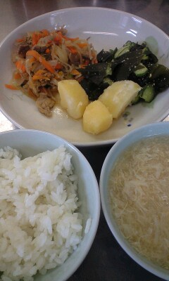 ご飯。スタミナ焼き。粉ふきいも。すみそあえ。たまごスープ。