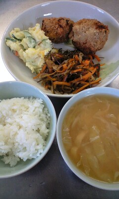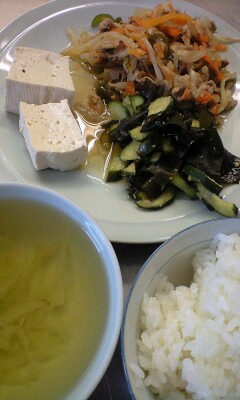 ご飯。スタミナ焼き。豆腐。きゅうりとわかめのすみそあえ。スープ。今日も暑いですね。暑さにまけないように食事もとりたいものですね。夏はゆかりふりかけをだしています。ふりかけがあるとごはんが食べられるようですね。