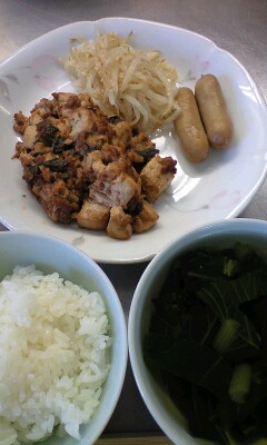 ご飯。麻婆豆腐。ナムル。ウインナー。スープ。今日も暑い日でした。スープはたまごスープの予定でしたが、青なをもらったので変更しました。たまごスープじゃないの? と聞きにきた子がいました。楽しみにしていたのかな〜また作りますね。