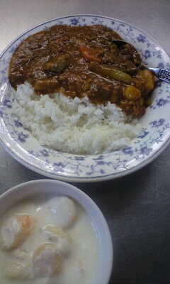 夏野菜カレー。ヨーグルト和え。今日のカレーにはかぼちゃ、なす、いんげんも入りました。みんなやさいが入っているのによく食べていました。