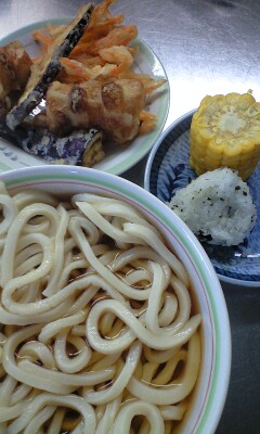 てんぷらうどん。とうもろこし。おにぎり。にんじんのてんぷらは人気があります。野菜が苦手な子も美味しく食べられるようです。