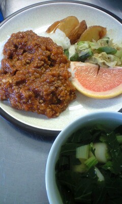 ドライカレー。フライドポテト。キャベツといんげんの和えもの。スープ。くだもの。