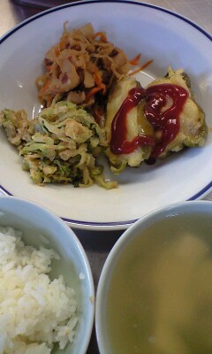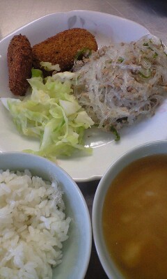 ご飯。カレーコロッケ。春雨とピーマンの炒めもの。塩もみ。大根の味噌汁。今日は春雨とピーマンの炒めものを作りました。塩味でさっぱりたおかずになりました。やっぱり夏は塩味がいいな〜と思いました。